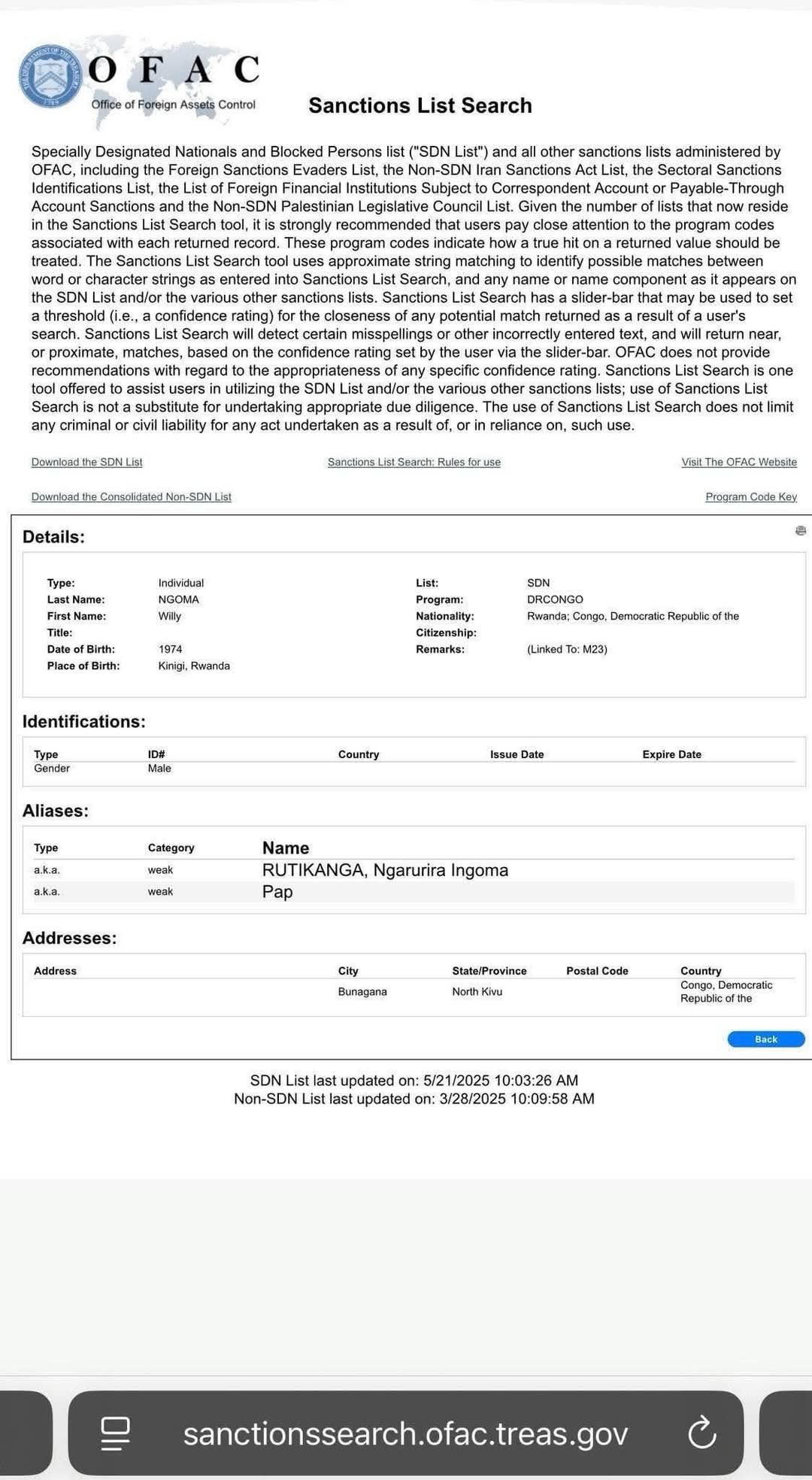 Cet étonnement de ces sources se réfère au traitement réservé à Magloire Paluku sujet congolais par rapport à celui de Rutikanga Ngarurira Ingoma alias Willy NGOMA, sujet rwandais, tel que mentionné sur la liste des rebelles du M23 sanctionnés par les Etats unis.
